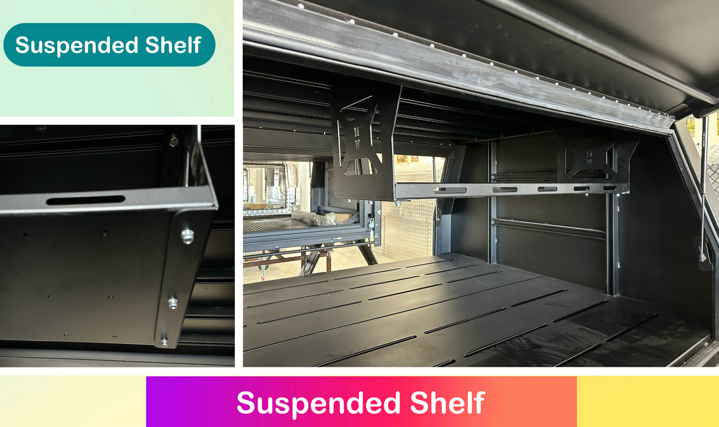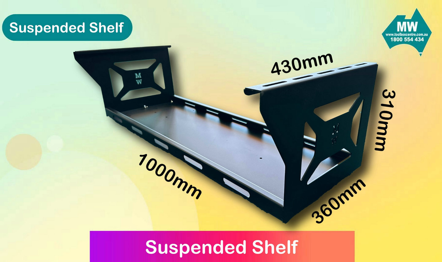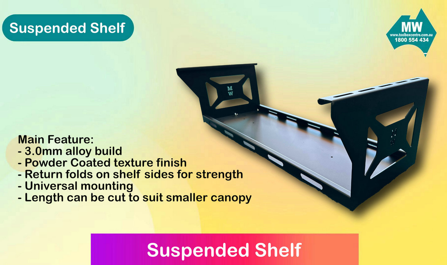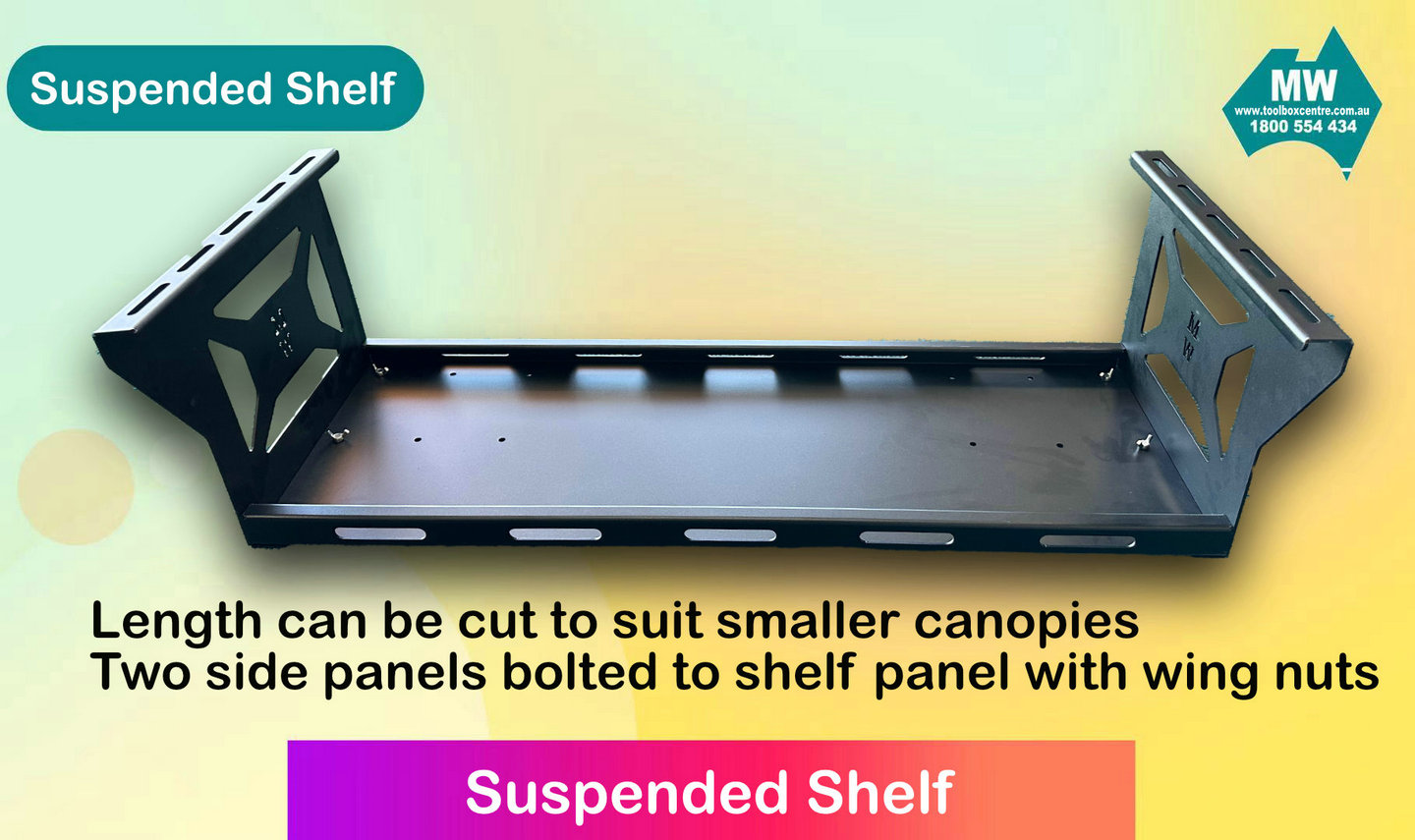 MW Suspended Shelf kit is the perfect storage solution for your ute canopy. This product is made for all tradesman and touring purposes / quality. Heavy duty 3.0mm alloy construction for light-weight and durability. Overall size of 1000mm long can be manually cut by 100mm increment, down to 600mm if required to suit smaller size canopies. Provided with uni-strut channel nuts and M10 bolts making it easy to mount to uni-struts inside your MW custom canopies. May require other fittings to install to canopies with non-unistruts.