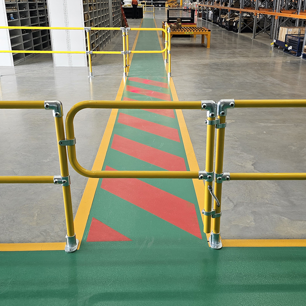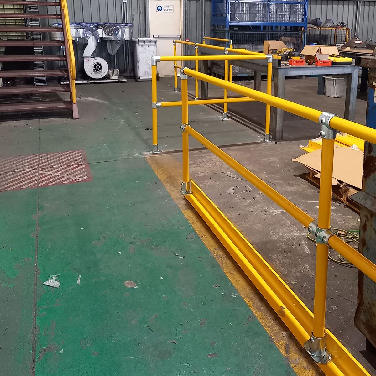 | DISTANCE BETWEEN RAILS | For installations on a Mezzanine floors the rails can not be spaced more than 450mm apart, and a kick rail is required in this type of installation For installations on a warehouse floor or at floor level, the knee rail should not be set higher than 560mm from the ground and the hand rail should not have more than a 450mm gap from the knee rail |