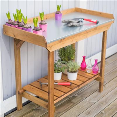 This stylish and design inspired Gardener’s Table with Tin Surface is what every gardener needs! This durable table has been treated for protection against wood rot and decay and made from FSC timber from well managed forests. The clean-lined tin work surface will provide added protection while still allowing for easy cleanup. The slatted bottom shelf is ideal for storing tools and planting accessories as well as providing space for potting plants and transplanting seedlings.