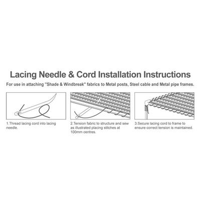 This Lacing Cord and Needle are ideal for attaching fabric to timber and metal frames, steel posts and cable. The lacing cord has a strong braided, UV stabilized yarn construction that will easily lace together 6’10” of shade fabric. Includes 80ft. of Lacing Cord.