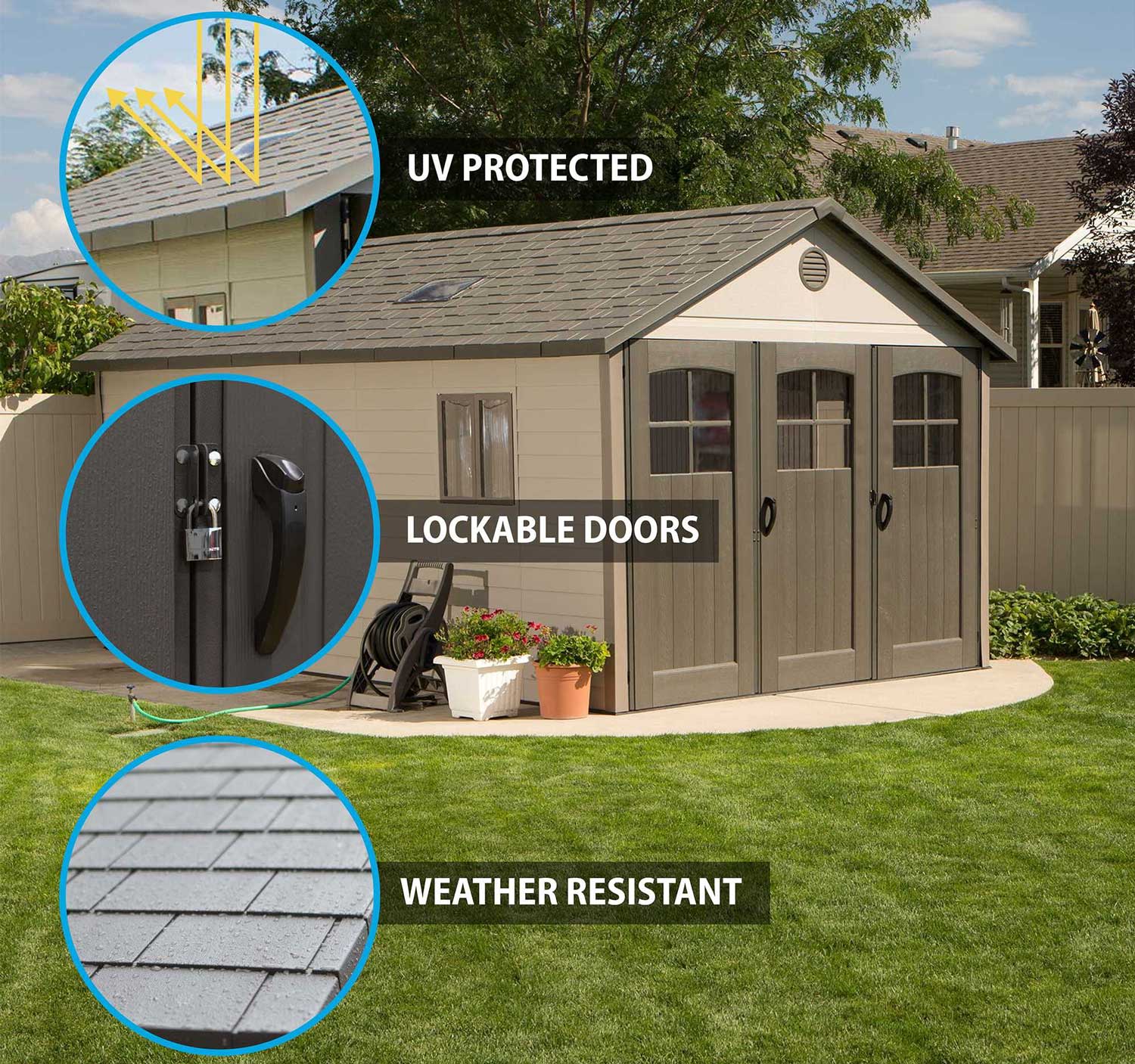 Constructed from UV-stabilised high-density polyethylene (HDPE) with steel reinforcing members, the LIFETIME 11′ x 18.5′ is designed for durability and very low maintenance. The double doors have full-length steel hinges and are lockable. The black HDPE floor is slip resistant and resistant to oils, solvents and stains.