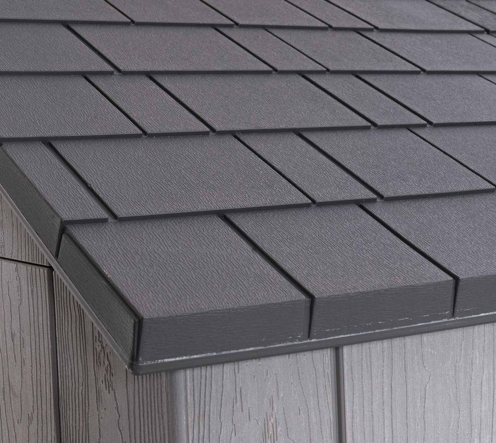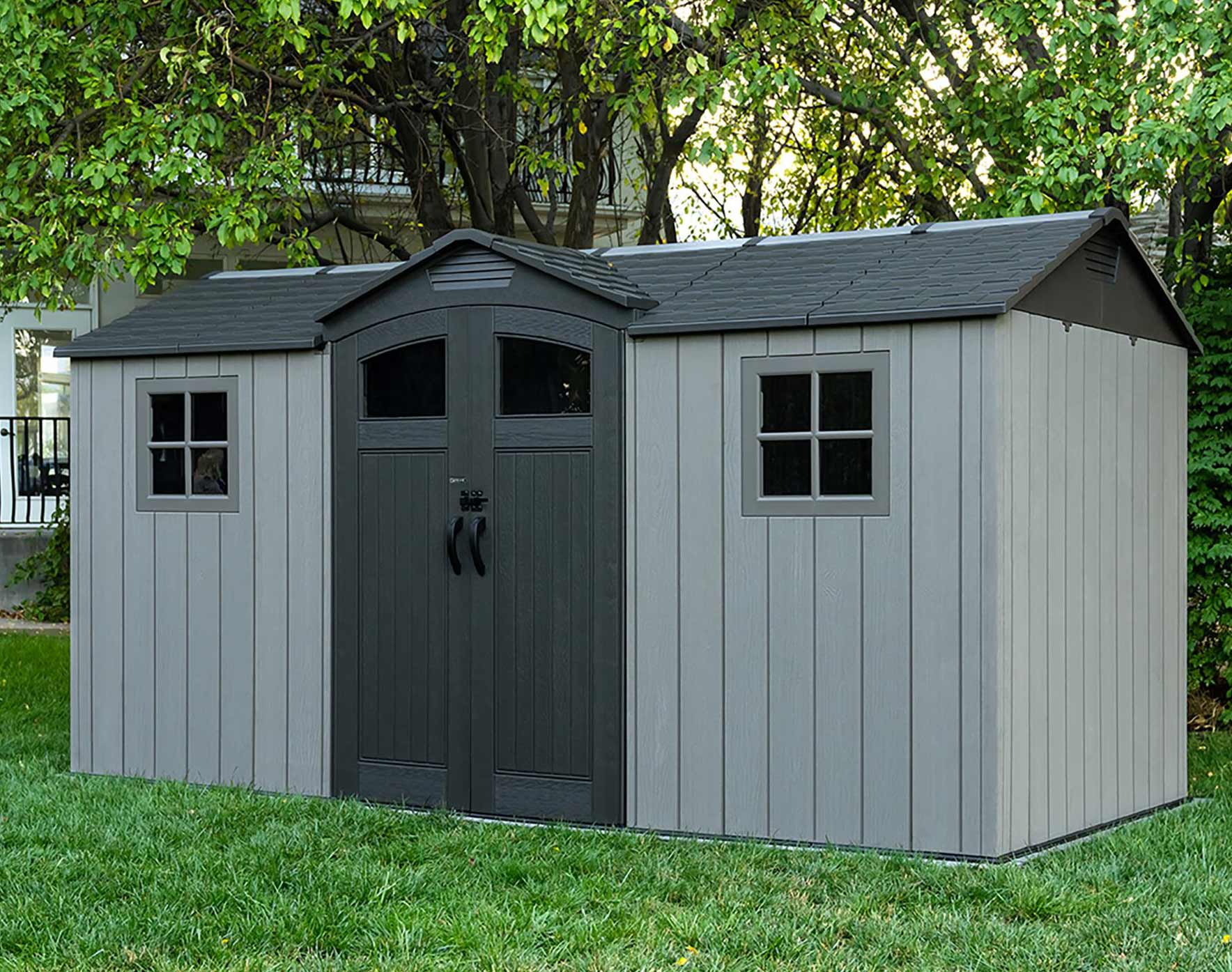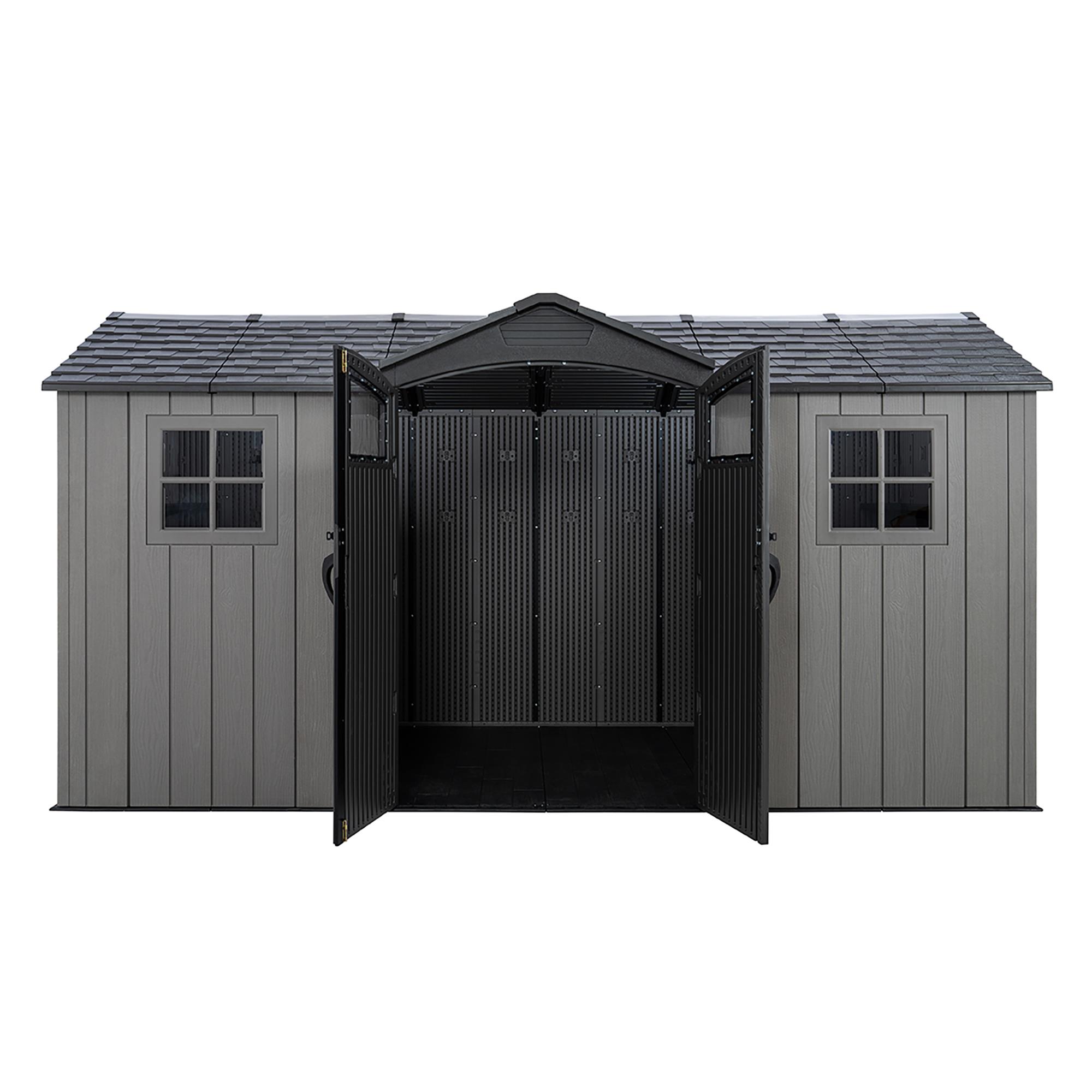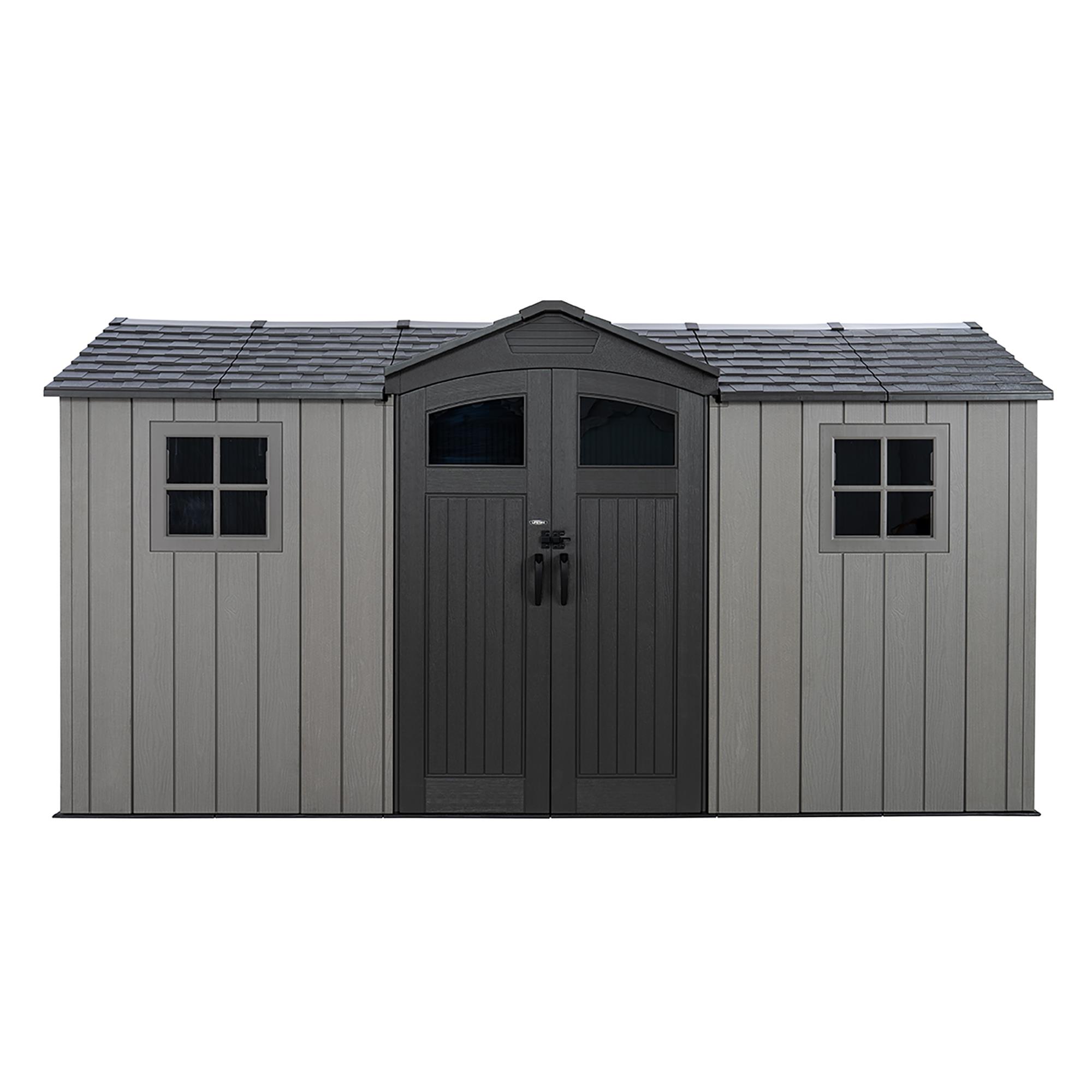 The LIFETIME 14.5 x 7 foot RESIN GARDEN SHED a stylish outdoor storage shed to keep your garden equipment, tools, bikes and toys safe, dry and secure. The moulded woodgrain wall panels and simulated shingle roof ensure that it is an attractive addition to your property as well as a solution to your storage needs. The double door entry gives you easy access to your storage space, which has good headroom and has good provision for natural lighting.