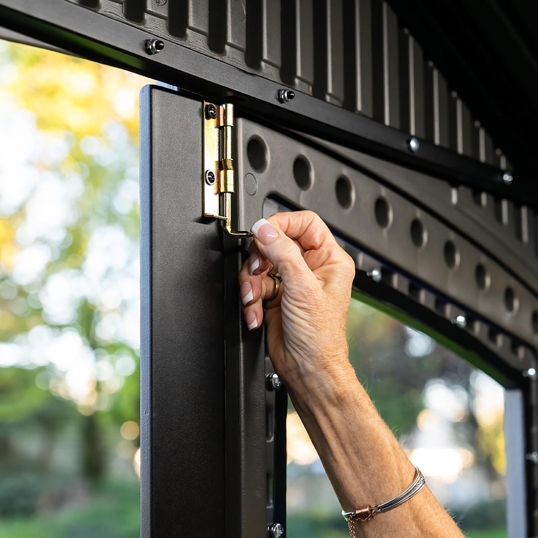 A unique side-entry design gives you a great look and easy access to your space. The shed is made of steel-reinforced high-density polyethylene and a sturdy double wall system for maximum durability and longevity, and heavy-duty steel trusses provide exceptional roof strength.