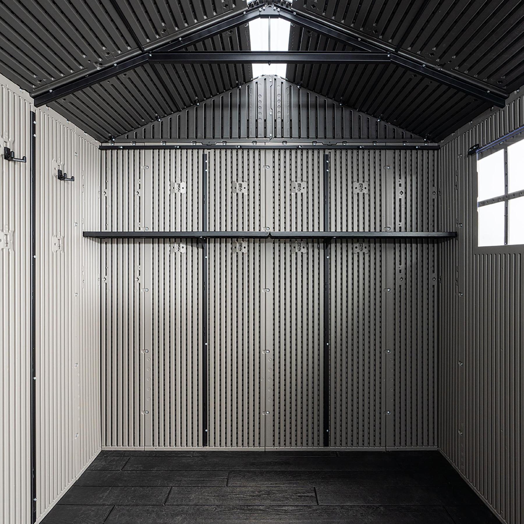Lifetime 14.5 ft. x 7 ft. Side Entry Outdoor Storage Shed made of High-density Polyethylene (HDPE) resin with powder-coated steel-reinforcement throughout the doors, roof, and walls. The shed is a side-entry design with a high-pitched roof and wood grain texture on the exterior walls. It includes six (6) intermittent skylights, three (3) screened vents, one (1) door set, one (1) lockable slider latch, one (1) height-adjustable fold-in-half shelf, six (6) wall hooks, two (2) windows, and one (1) shed floor (foundation not included). Assembly required. 10-year limited warranty.