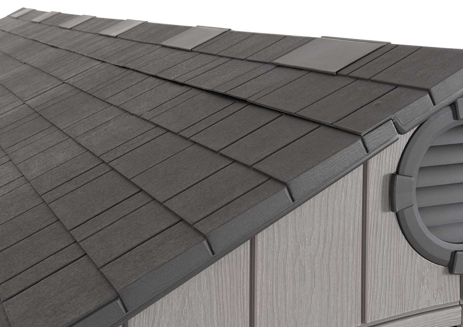The LIFETIME 8 x 15 PLASTIC GARDEN SHED – a stylish outdoor storage shed to keep your garden equipment, tools, bikes and toys safe, dry and secure. This shed is made in the U.S.A. – you can be confidant in the quality and features of an American made product. The moulded woodgrain wall panels and simulated shingle roof ensure that it is an attractive addition to your property as well as a solution to your storage needs. With various features including shatter proof windows, screened vents, skylights, height-adjustable shelving, and much more, a Lifetime Shed is the perfect addition to your backyard.