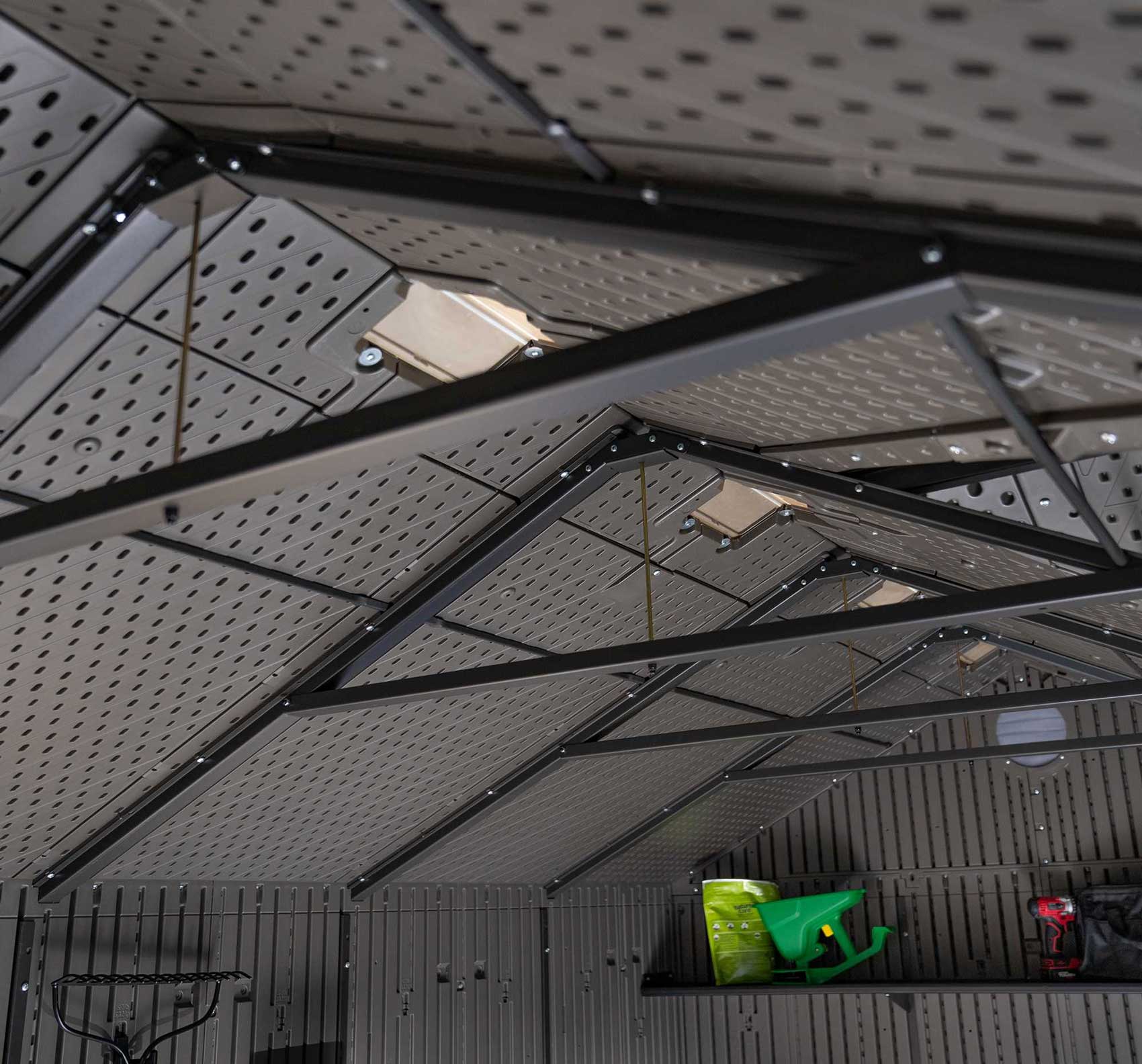 Constructed from dual-wall UV-stabilised high-density polyethylene (HDPE) with steel reinforcing members, the LIFETIME 8 x 15 plastic shed is designed for durability and very low maintenance. The steeply pitched roof offers excellent storage space and quick drainage of rainwater, and features heavy-duty steel trusses for additional strength. The double doors have full-length steel hinges and are lockable. The black HDPE floor is slip resistant and resistant to oils, solvents and stains.