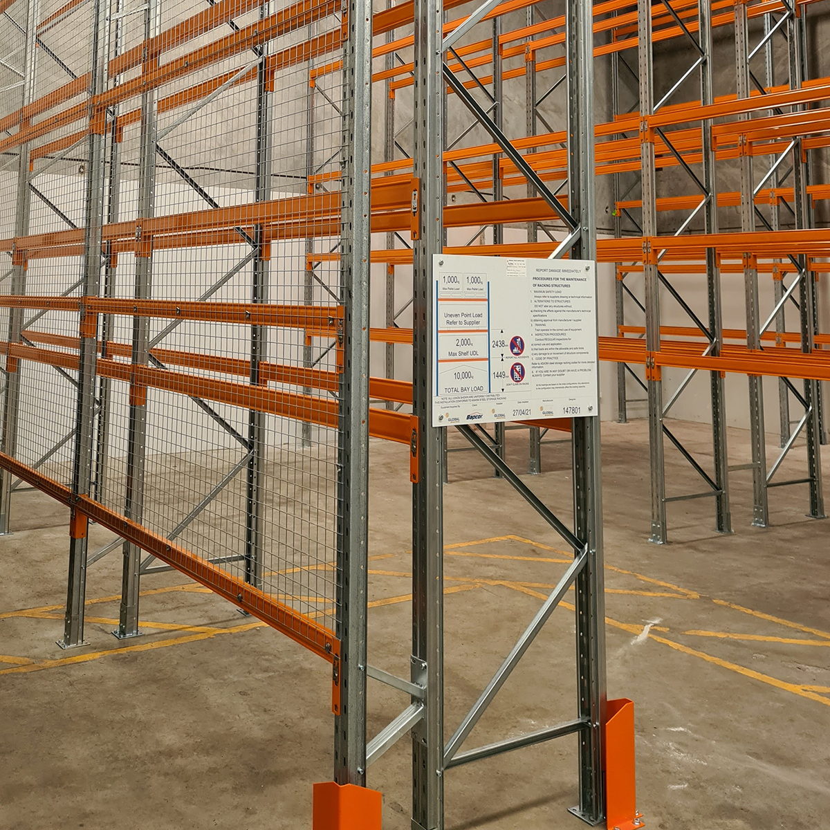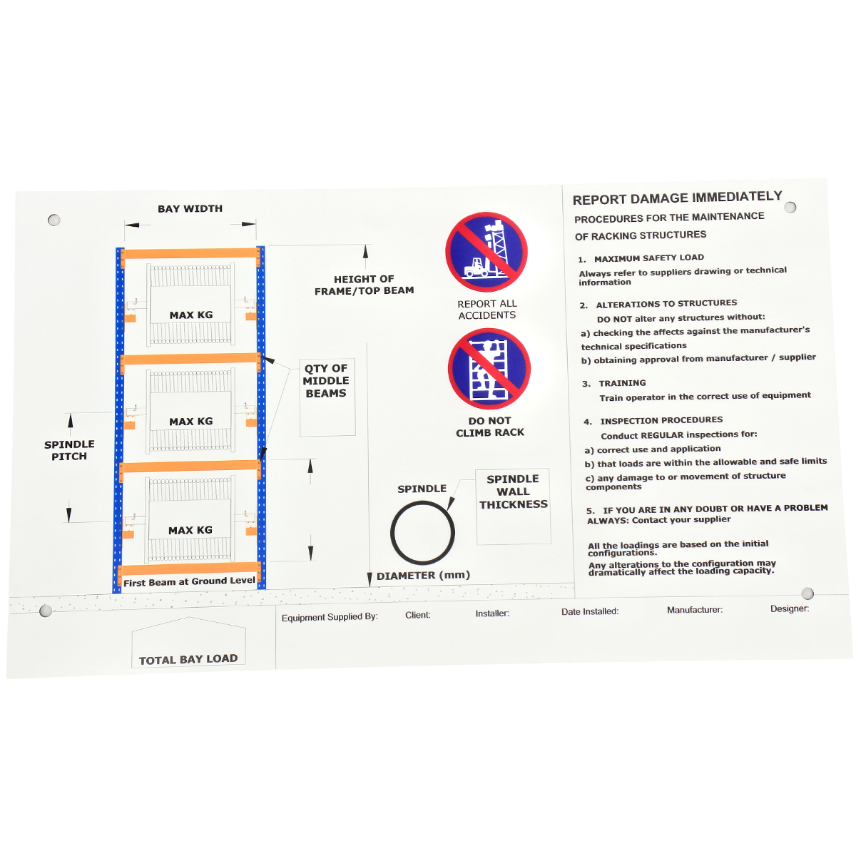 Load signs used for pallet racking, drive in racking, cable racking and cantilever racking must be fixed to the end of the frame and above 2000mm from the ground. Signs for other applications will need to be installed in a position which can be viewed by the user of the equipment.