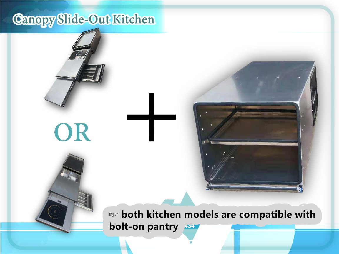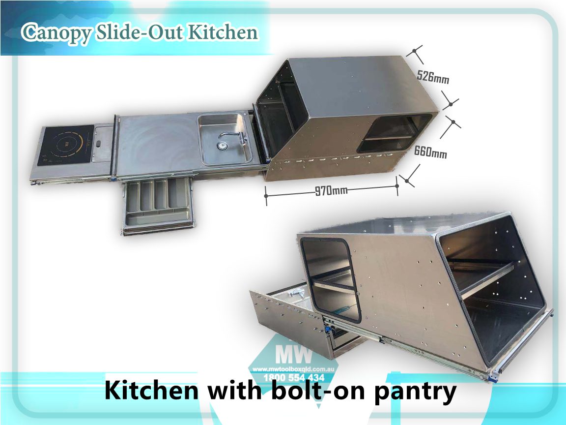 • Our Ultimate Slide-out Kitchen is 100% designed by Aussie camping and 4WD enthusiasts that know and understand our family camping needs. This is truely a must have kitchen setup for your ute canopies, 4WDs, wagons, campers , camper trailers and marine. The shell is made out of 2.5mm heavy duty tensile corrosion resistant aluminum and fully TIG welded around. Fitted with 125KGs rated heavy duty telescopic lockable runners (able to lock at closed position and fully extended position) to reach the best dust and sand resistance result. The sliding bench, sink and tap, and the sliding table are all made out of food grade stainless steel. The bolt-on pantry (can be added to both Slide-out Kitchen or Slide-out Induction Kitchen models) is also made out of 2.5mm heavy duty tensile corrosion resistant aluminum, with rubber seals on all open edges.