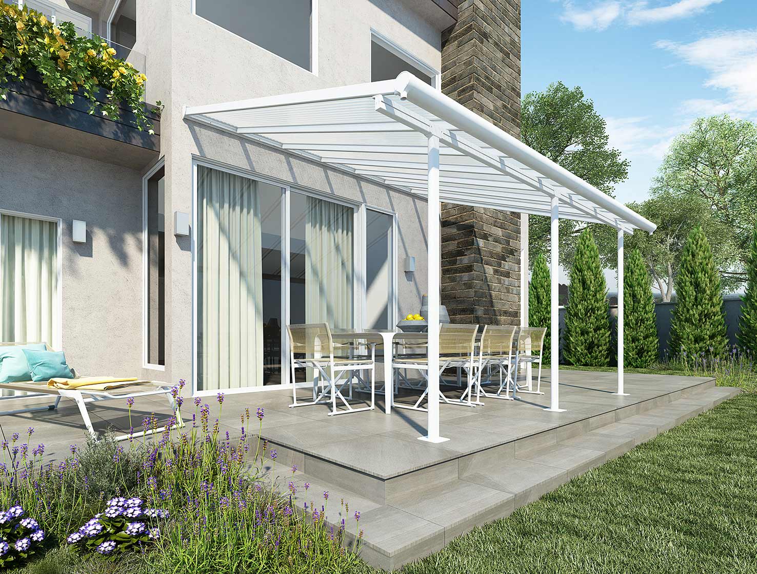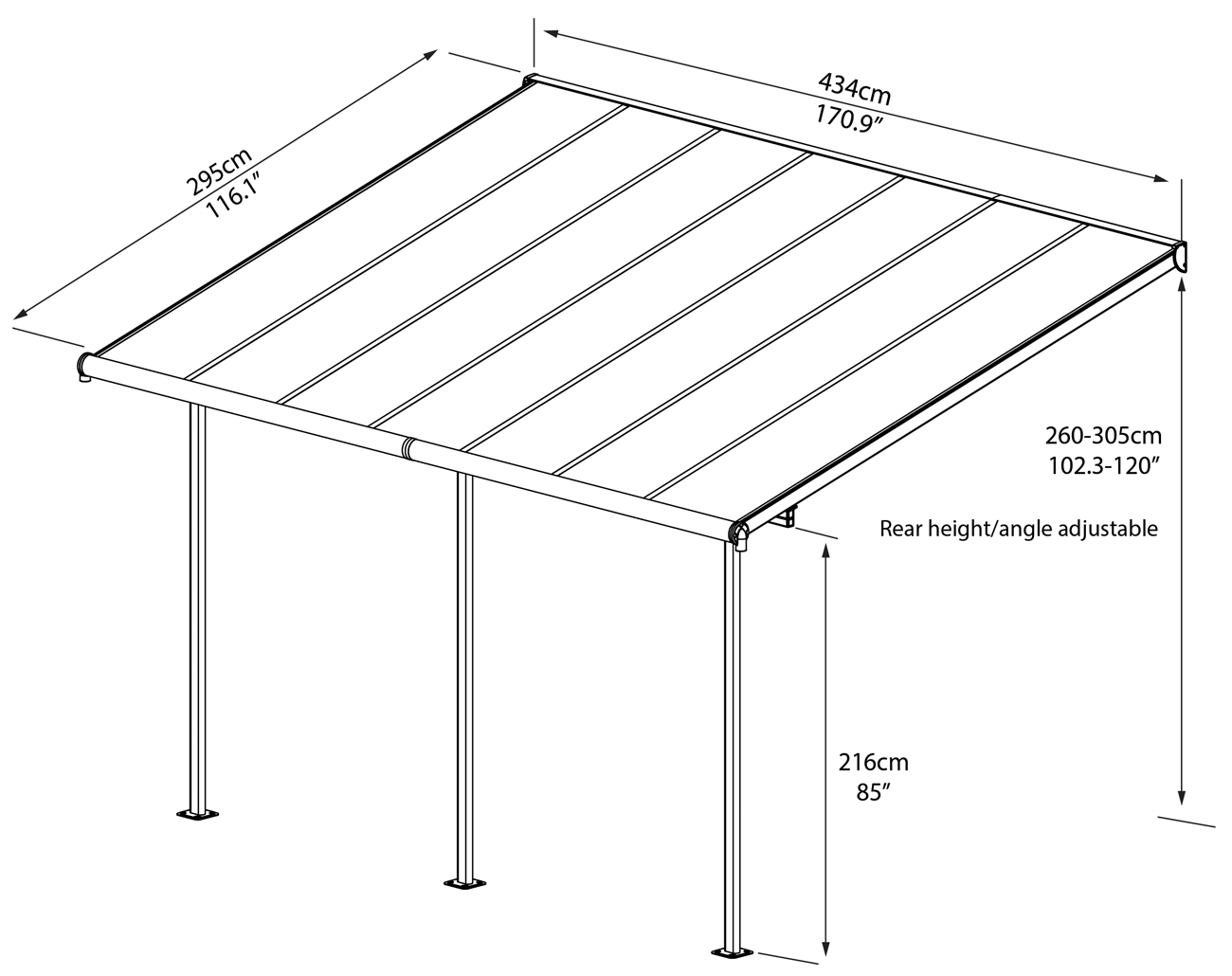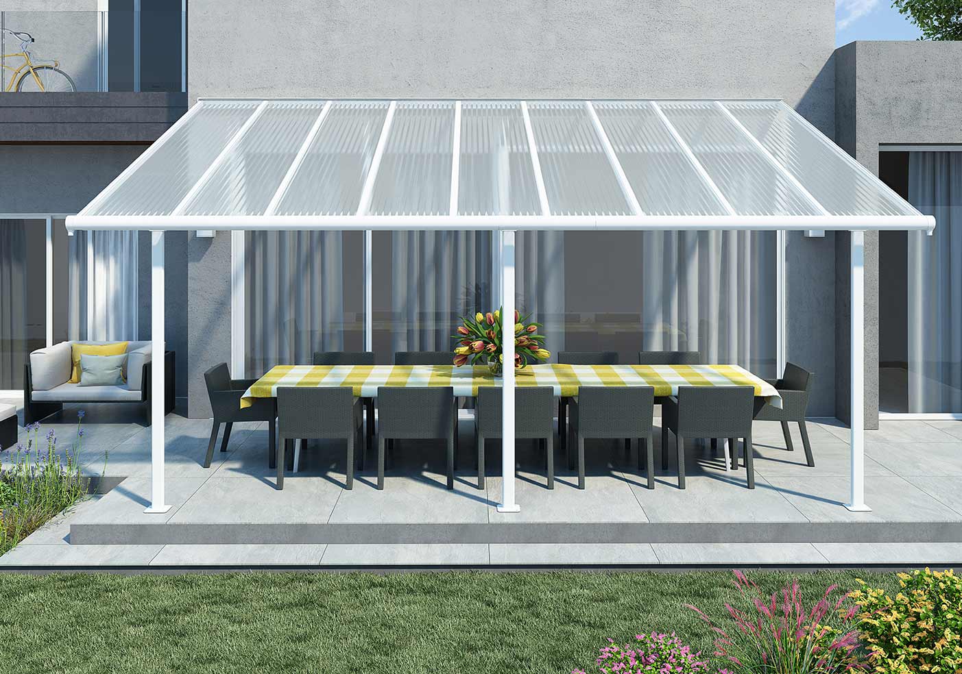 The SIERRA Patio Cover is a maintenance free roofing solution allowing for various outdoor uses such as a patio cover, car port, sun lounge etc. Protect your furniture and items from hazardous weather and harmful UV rays! Enjoy family get-together’s and cookouts without the fickle weather ruining your fun. A beautiful, sturdy addition to your outside living space that is strong and stable. The CANOPIA – PALRAM SIERRA Patio Cover is a high performance structure, with flexible positioning poles enabling you to set your required height at the wall connection, and between the poles at the front. It was designed to be simply assembled by 2 people, using the Click N Lock roofing system for safe and simple assembly, locking the glazing between the structure rods and preventing water from penetrating the glazing. It requires no experience, no special skills, and no special tools.