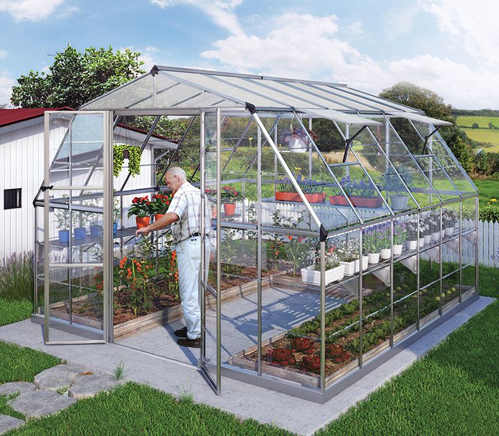 Our SILVER LINE GREENHOUSES are constructed from strong extruded aluminium frames and panels of almost unbreakable clear polycarbonate. Polycarbonate has greater insulation properties than glass, blocking harmful UV rays but allowing 90% light transmission, resulting in more even humidity and temperature levels inside the greenhouse. See why polycarbonate is widely used instead of glass in greenhouses these days.