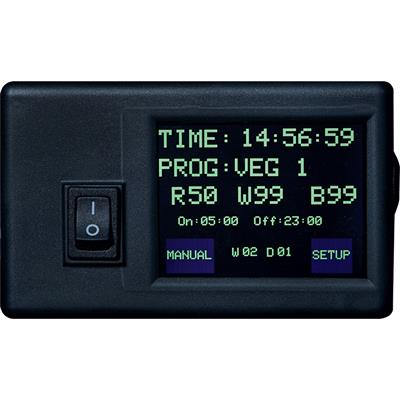 Compact touch screen controller can connect to an unlimited number of SolarSystem 1100, 550, or 275 LED fixtures and offers 24-hour and week by week timer. The controller regulates three spectrum bands for best growth.