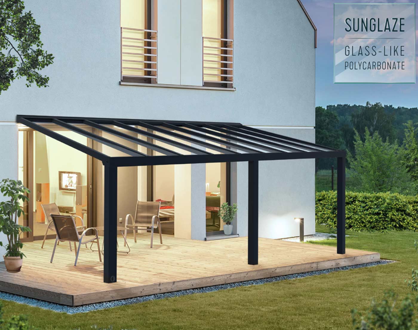 - Virtually unbreakable, 100% UV protected, crystal-clear 4 mm solid polycarbonate roof system – protect from harmful UV rays, hail and snow