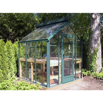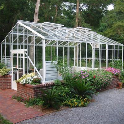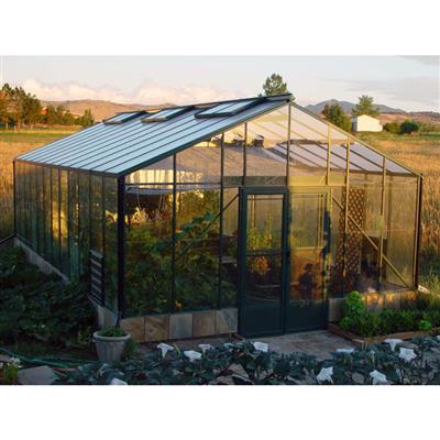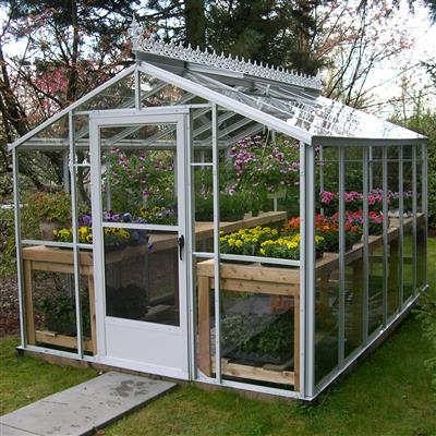 This popular Traditional Glass Greenhouse design provides maximum natural light for year-round gardening. Sizes vary from a small backyard garden model all the way up to a structure that would work well in a small nursery. This hobby greenhouse features a heavy aluminum frame, a roof slope of 24 degrees, and comes standard with beautiful clear 3mm tempered lapped glass covering on the roof and sidewalls. One piece 6mm glass is available at additional cost, just call and speak with a representative to confirm. It is structurally designed to carry a 30 lb snow load and winds of 80 mph. Choose from white or green baked-enamel finish.